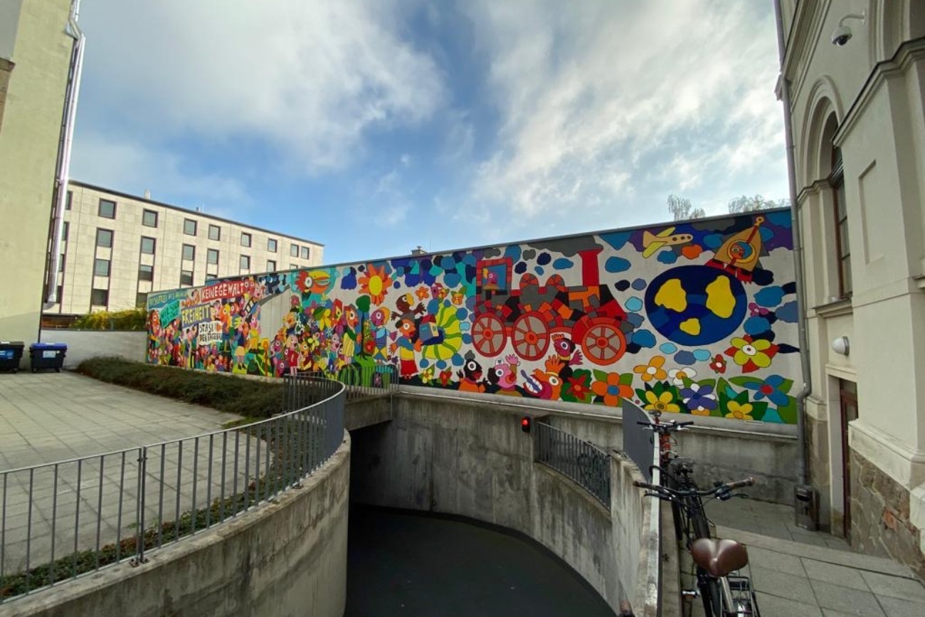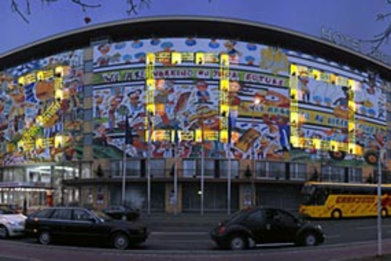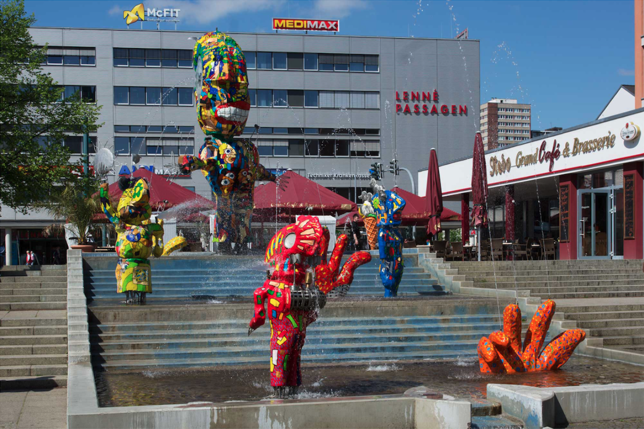 Fischer-Art schuf in den vergangenen Jahrzehnten viele Arbeiten im öffentlichen Raum. Bis Heute sind es über 30.000 qm Fassadenfläche, dabei hat Fischer-Art fast 600 Liter bunte Farbe verbraucht.
